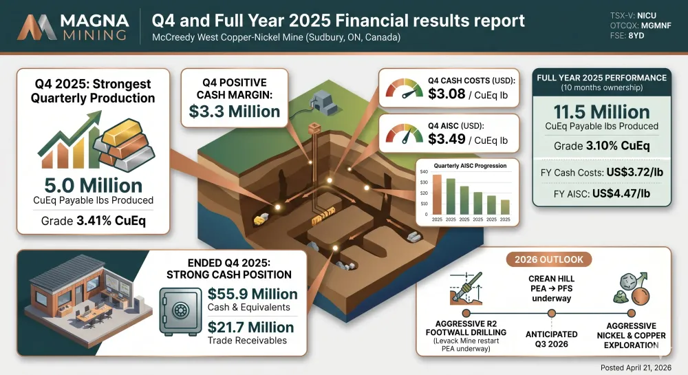 Magna Mining Inc. (TSX-V: NICU) (OTCQX: MGMNF) (FSE:8YD) is pleased to report fourth quarter and full year 2025 operating and financial results. All amounts are expressed in Canadian dollars unless otherwise indicated.